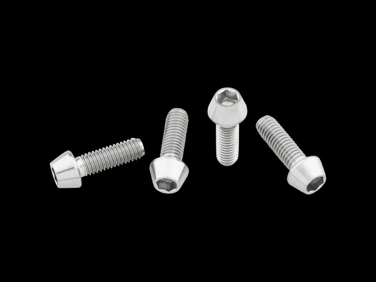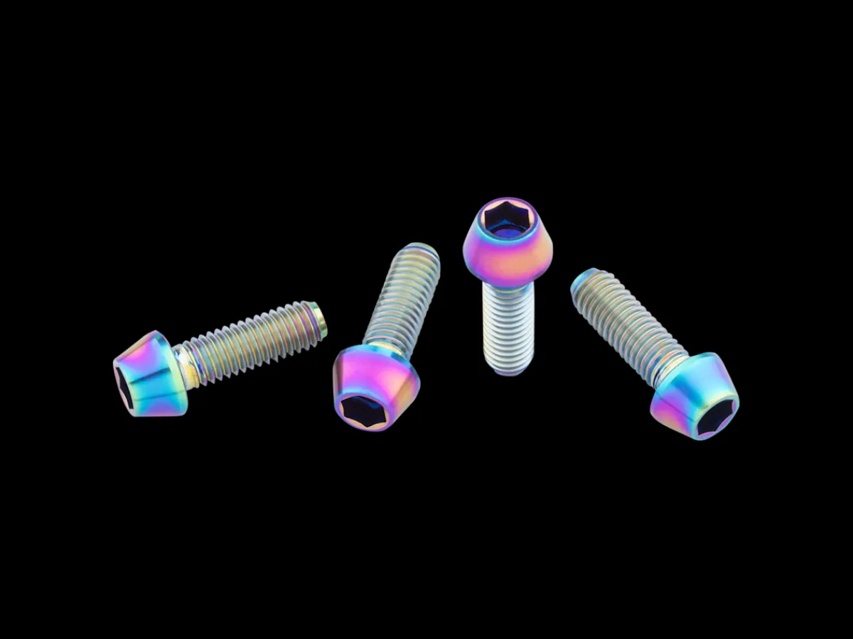 These M5x15mm titanium water bottle cage bolts offer a bit of flash and are stronger than aluminum bolts, making them a solid upgrade for cyclists who carry cargo by bolting it to their frame.