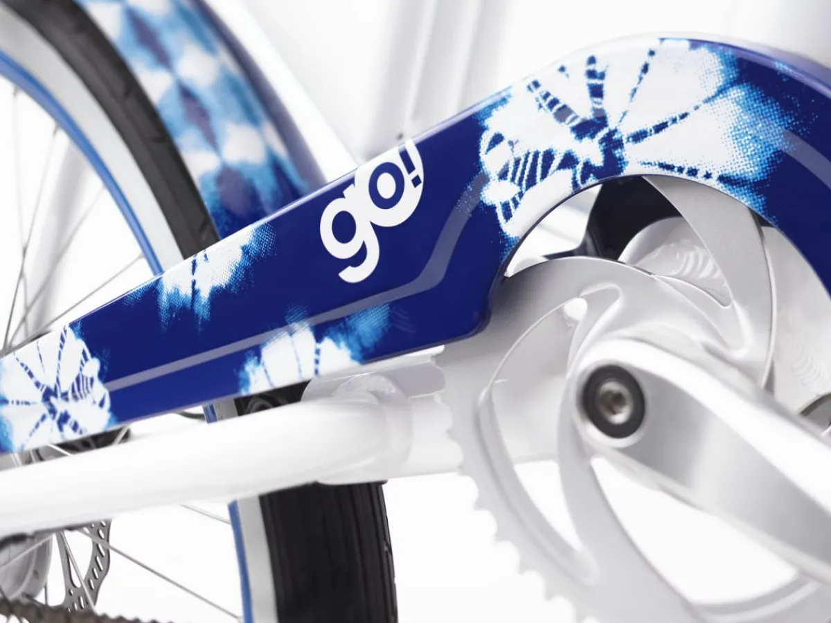 Shibori Go! takes inspiration from the ancient Japanese technique of indigo pigment dying. This e-bike features images of fabric created in Shibori style, which is similar to tie-dye where fabric is bunched and stitched to create intricate designs. Patchwork patterns and elements can be found on the fenders, frame and chainguard, as well as a custom bell. The designs are complimented by a crisp white to indigo fade on the frame making this a truly stunning bike.