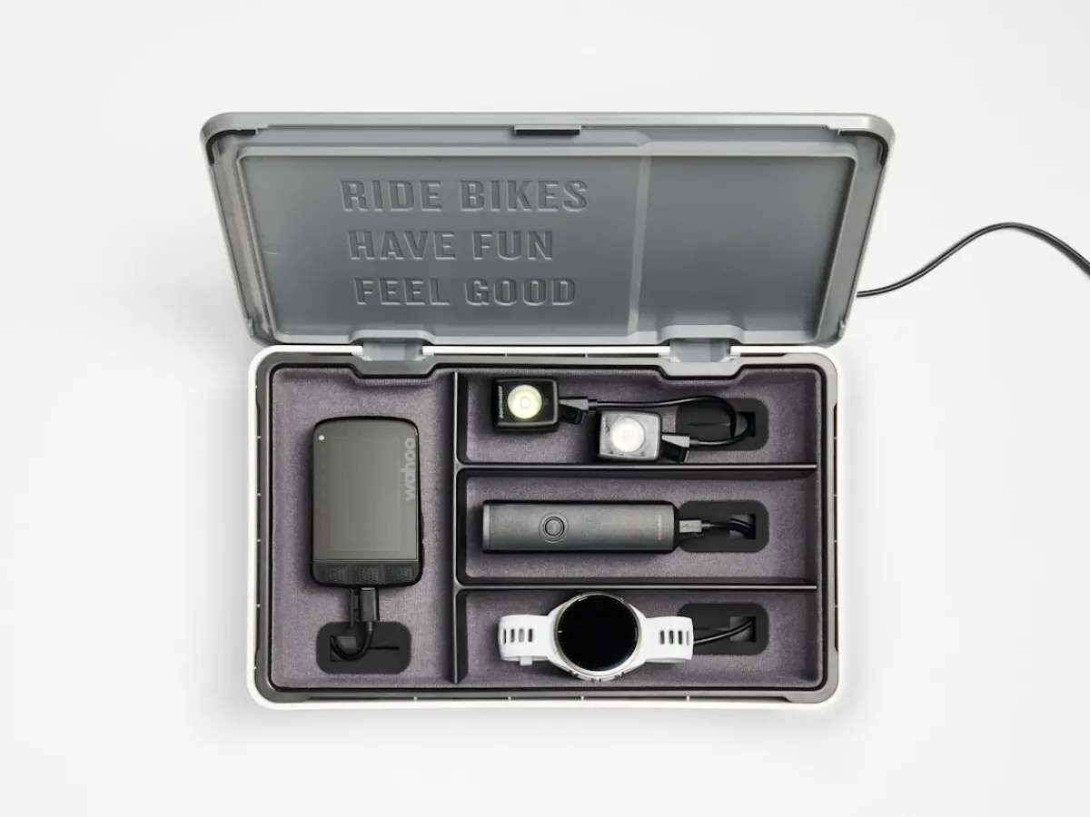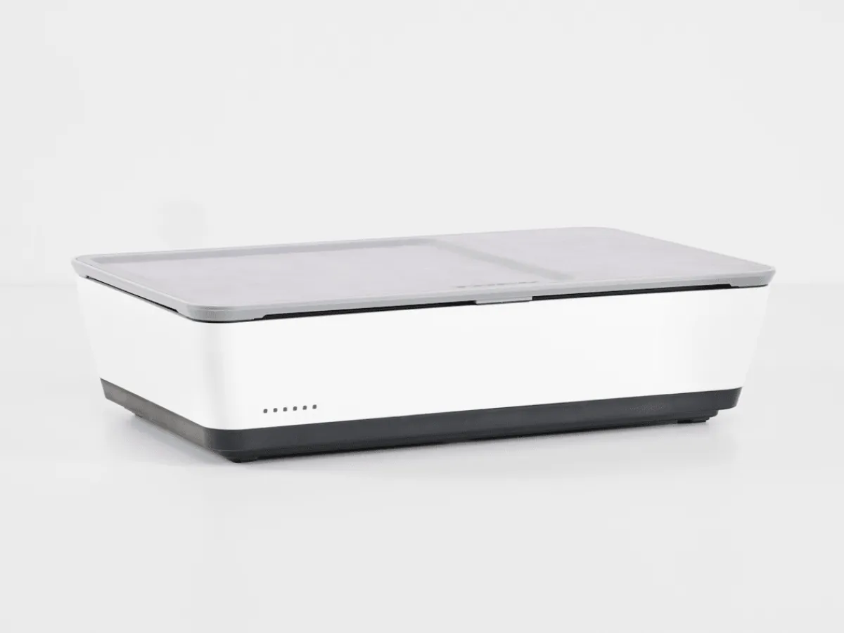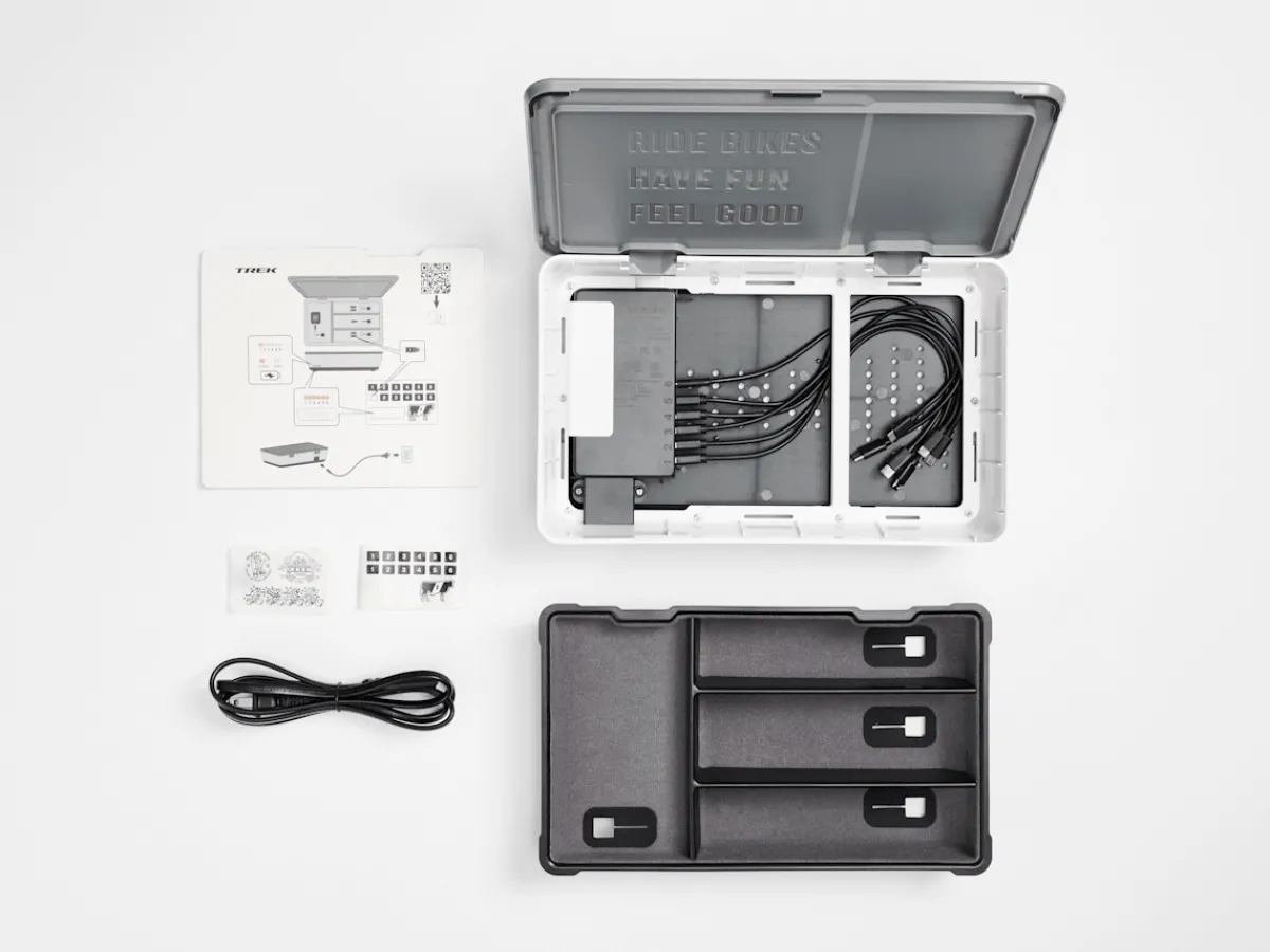 Trek CHRGtime Charging Station is a better way to charge all of your cycling accessories. Neatly charge up to six cycling lights, computers, and devices in a refined enclosure that tidies up your charging area and keeps the included USB and USB-C charging cables tucked away and hidden from view.